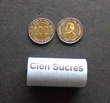 source coin is uncirculated Ecuador bimetal 100 sucres (which we also sell by the roll). #26.TEC $2.50 |
