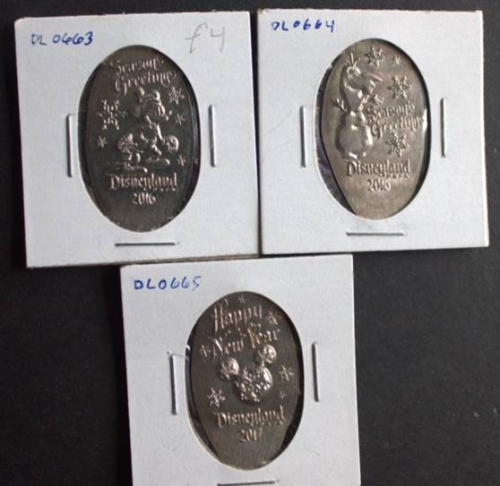 Disneyland holiday nickel set. Uncirculated, in 2x2 holders. With holiday backstamp. Parkpennies DL0663-0665. Retired. |