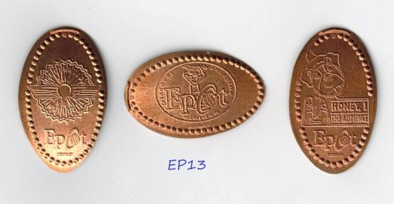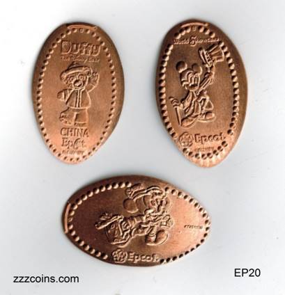 with hands out, Mickey in car (new in 2012; my #EP11) [EPC0052, 0126, 0127] · Innoventions – 8 pennies – Duffy, Goofy as