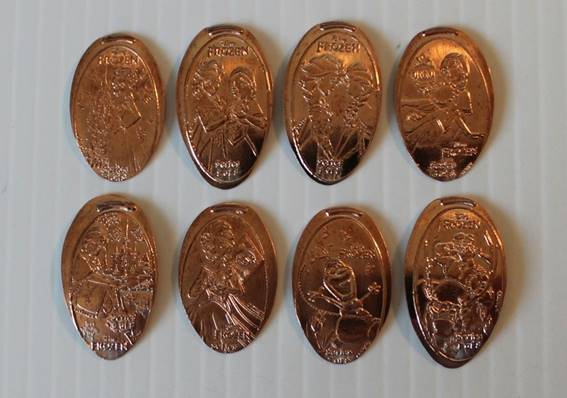 set of 8 coins featuring characters from Inside Out. Pressed on zinc pennies supplied by the