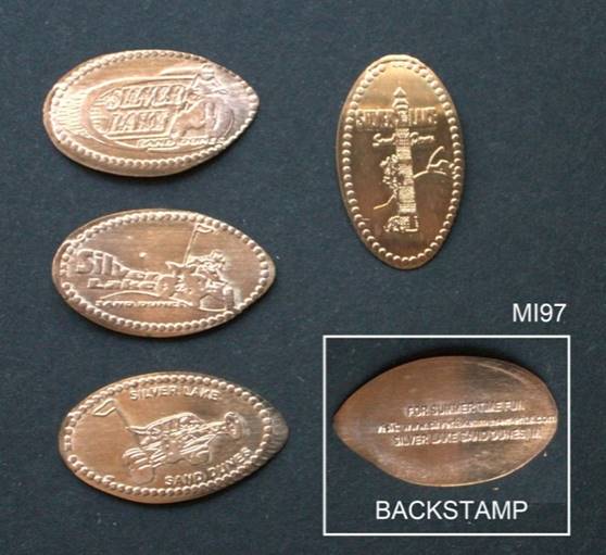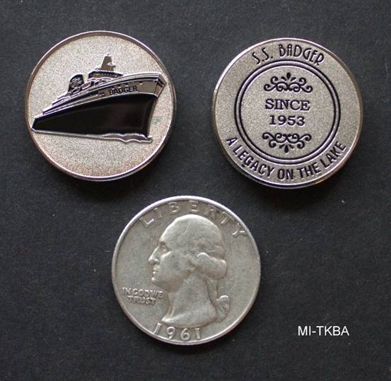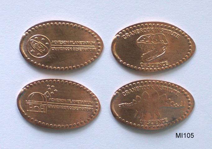 that have been cleaned and polished for a bright shine. Designs: Michigan map “fresh water spoiled”; pier with