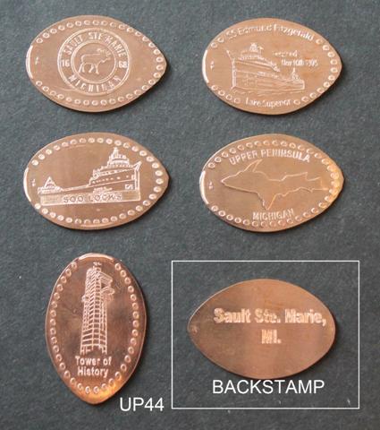 MI.” on the back. Designs: Circle with moose in it, “Sault Ste. Marie