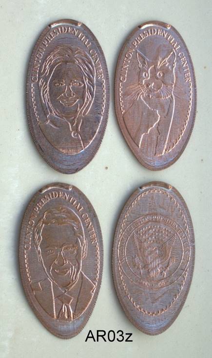 The Clinton museum charges too much for poor quality coins - $1 each for circulated zinc pennies. As a result, we have to charge more but made fewer sets.  Designs: Bill Clinton; Hillary Clinton; Socks the cat; Presidential seal.