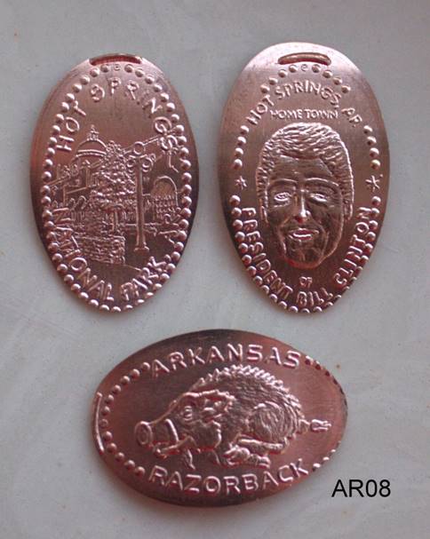 We obtained these retired sets from the current owner of the machine.  The machine had been located at the Hot Springs National Park Gifts & Souvenirs store.  Designs: Razorback; President Clinton; view of Hot Springs National Park.  All roll slightly short, cutting off border dots.