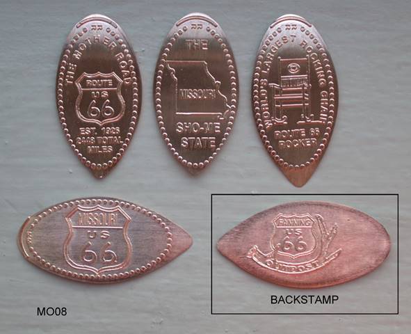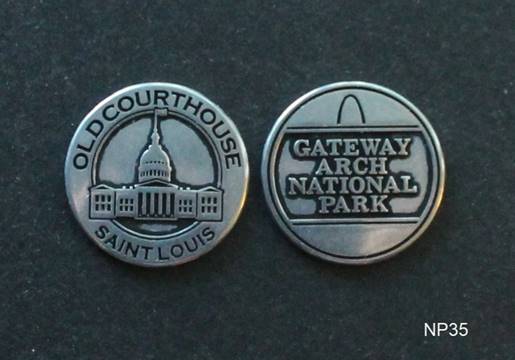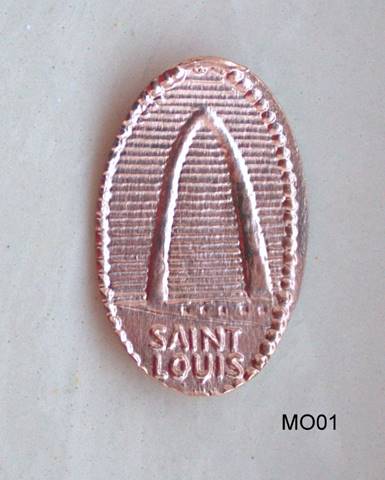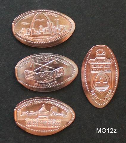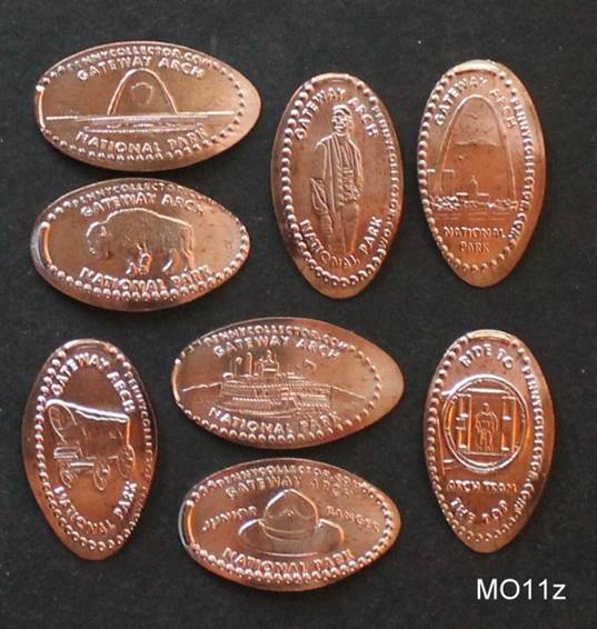 Two penny machines are found at the Arch’s gift shop.  Both dispense preloaded zinc coins.  The 8-die machine’s coins are in better shape than the 4-die machine.