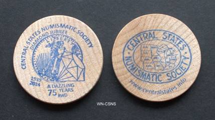 CENTRAL STATES NUMISMATIC SOCIETY WOODEN NICKEL Schaumburg, Illinois A wooden nickel promoting the CSNS. Photo shows both sides – you will receive a