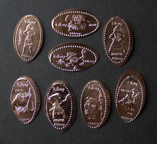 of Moana; 2 of Maui; HeiHei with Pua; and 2 coins with other characters The quality